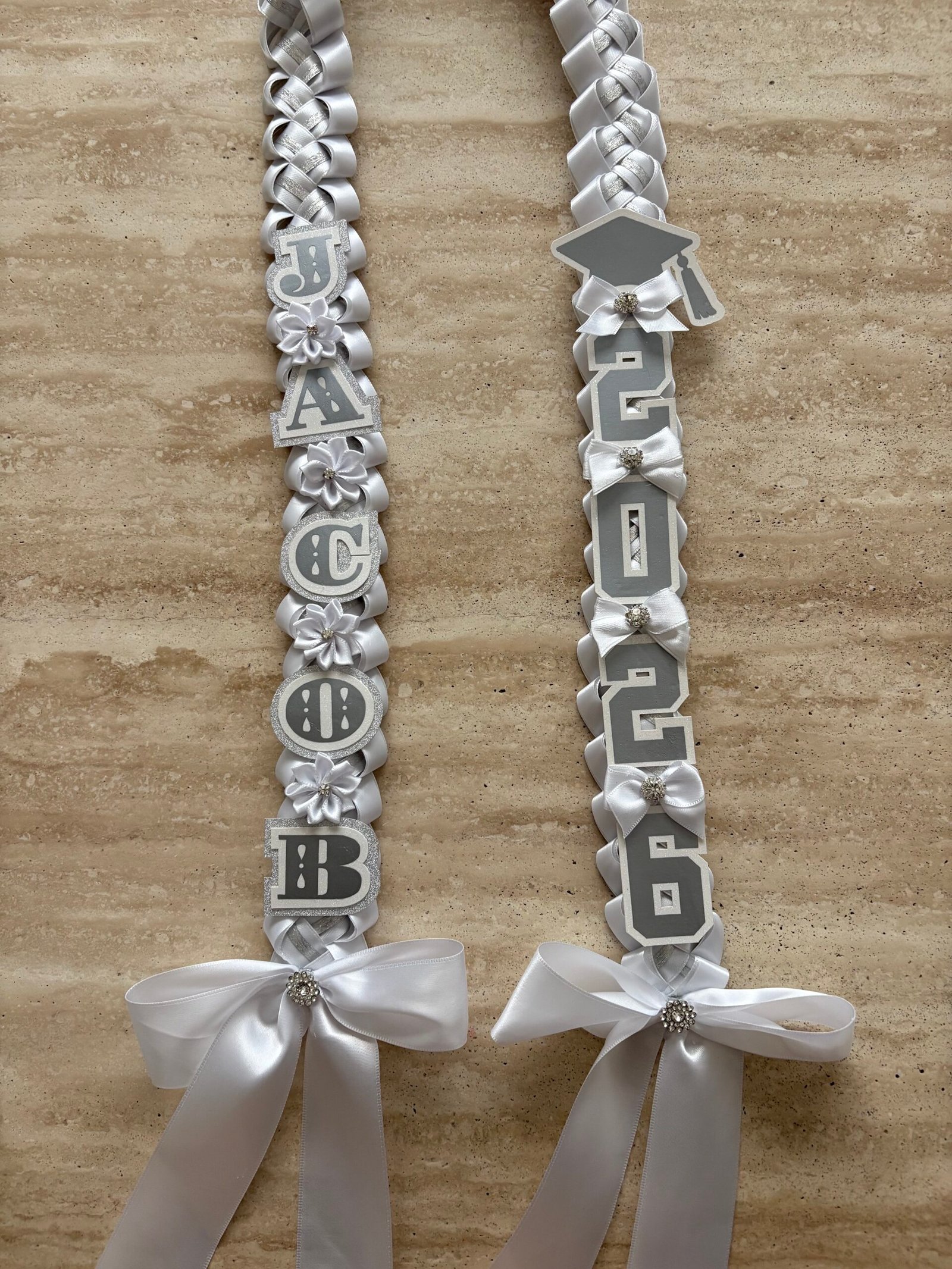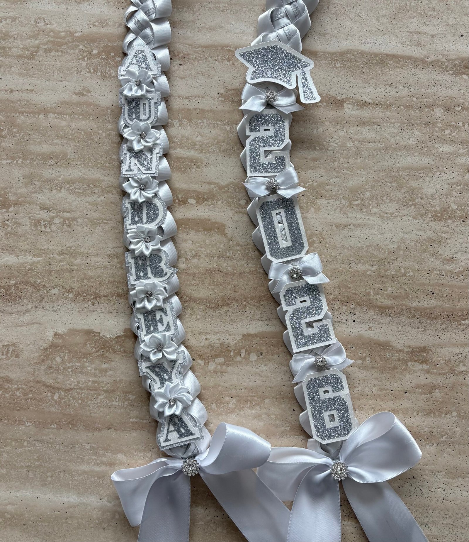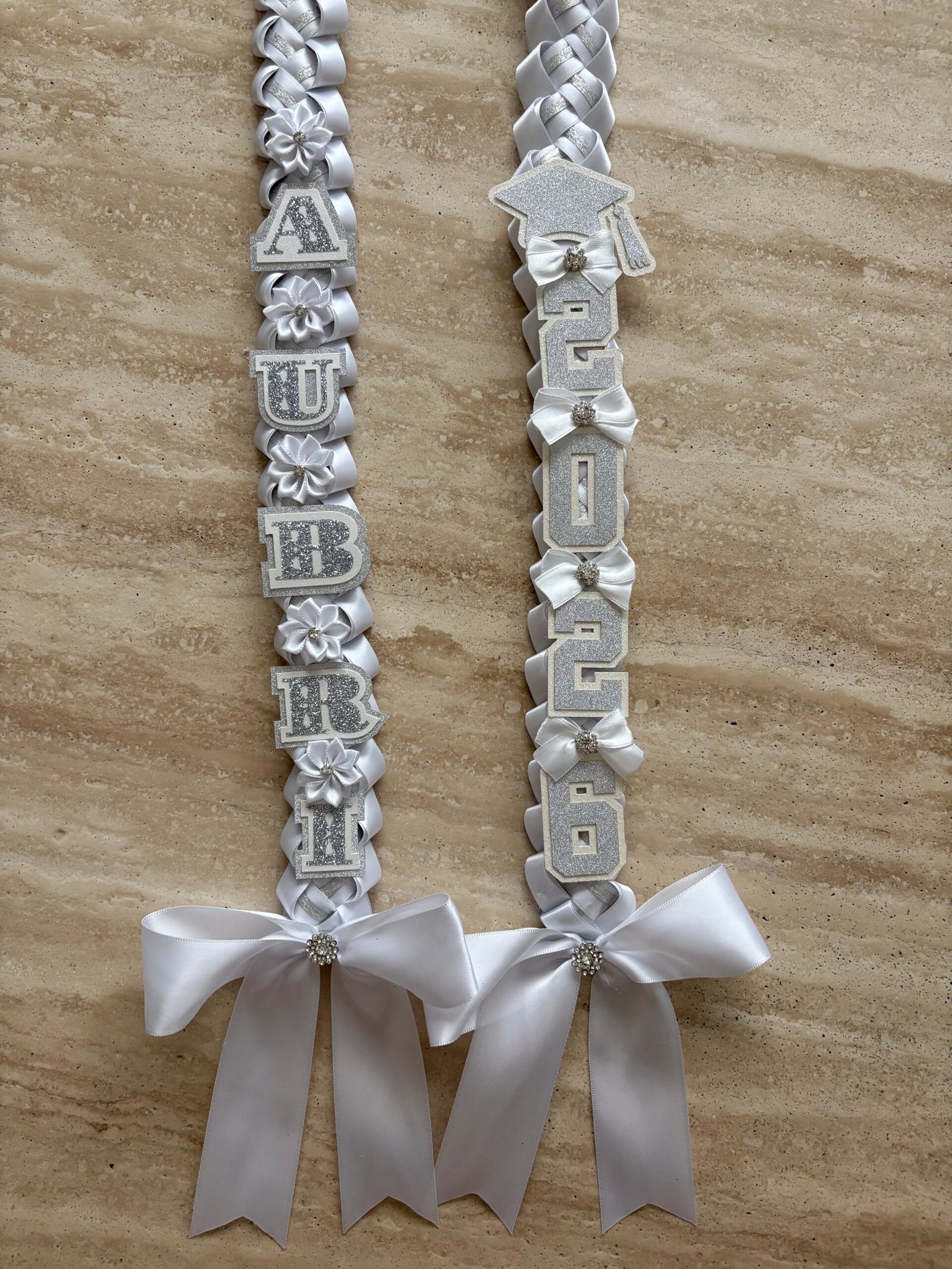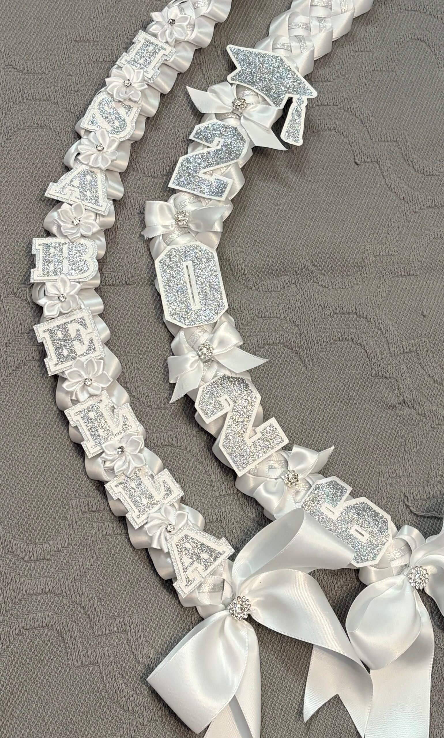 Make this milestone even more special with this personalized, elegant graduation lei. They are available in 4 ribbon combinations, triple-layer name cutouts, double-layer graduation year cutouts, double-layer cap cutout, handmade bows, flowers and lots of bling! Our leis are made with high quality double-faced satin ribbons, acetate ribbon for structure, and varying ribbons for the inner “stripe.”