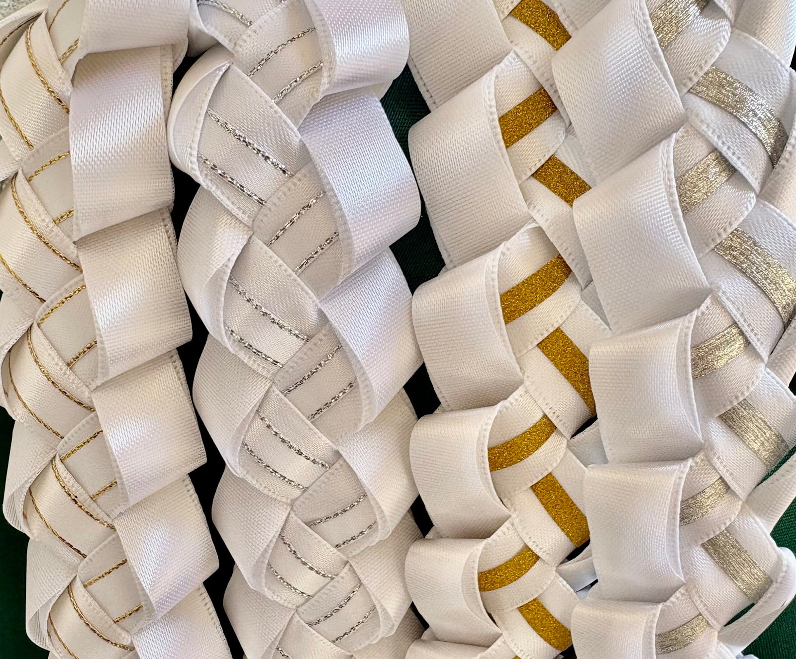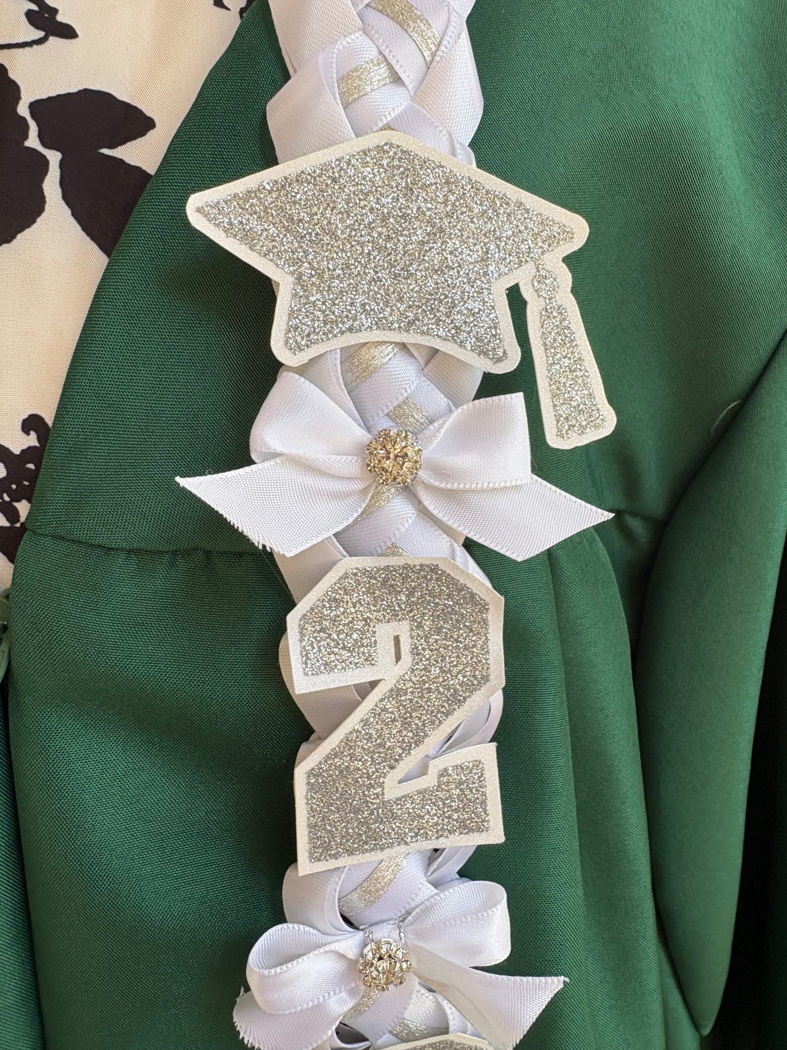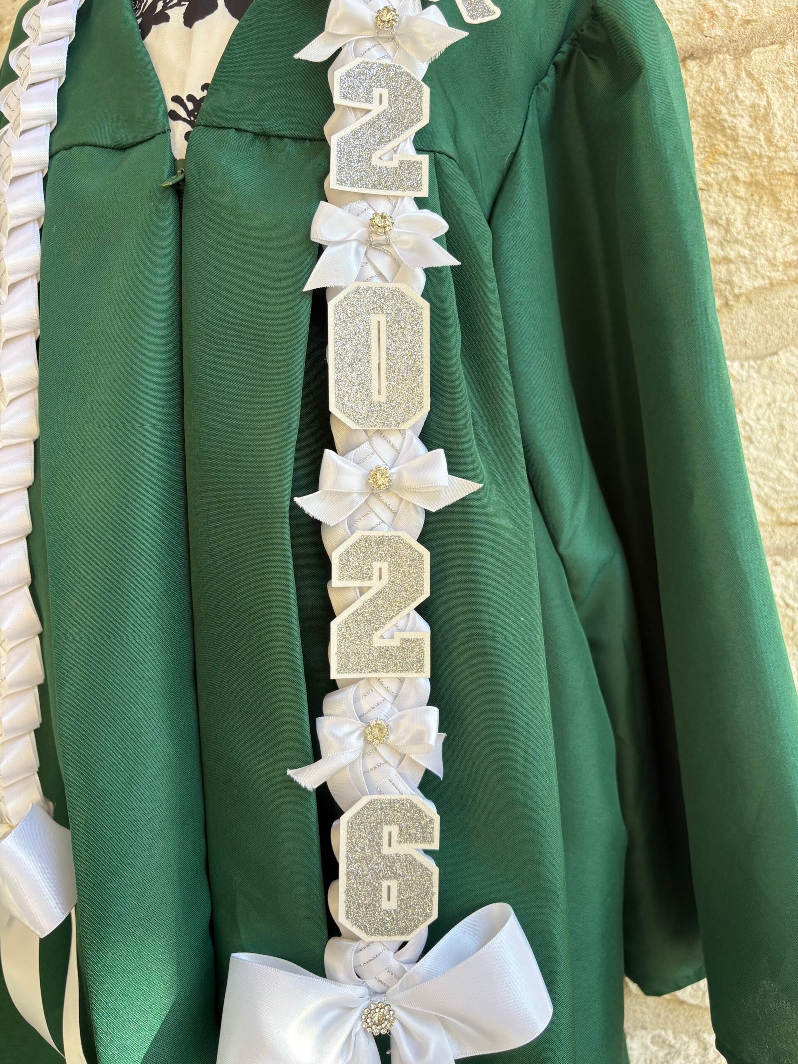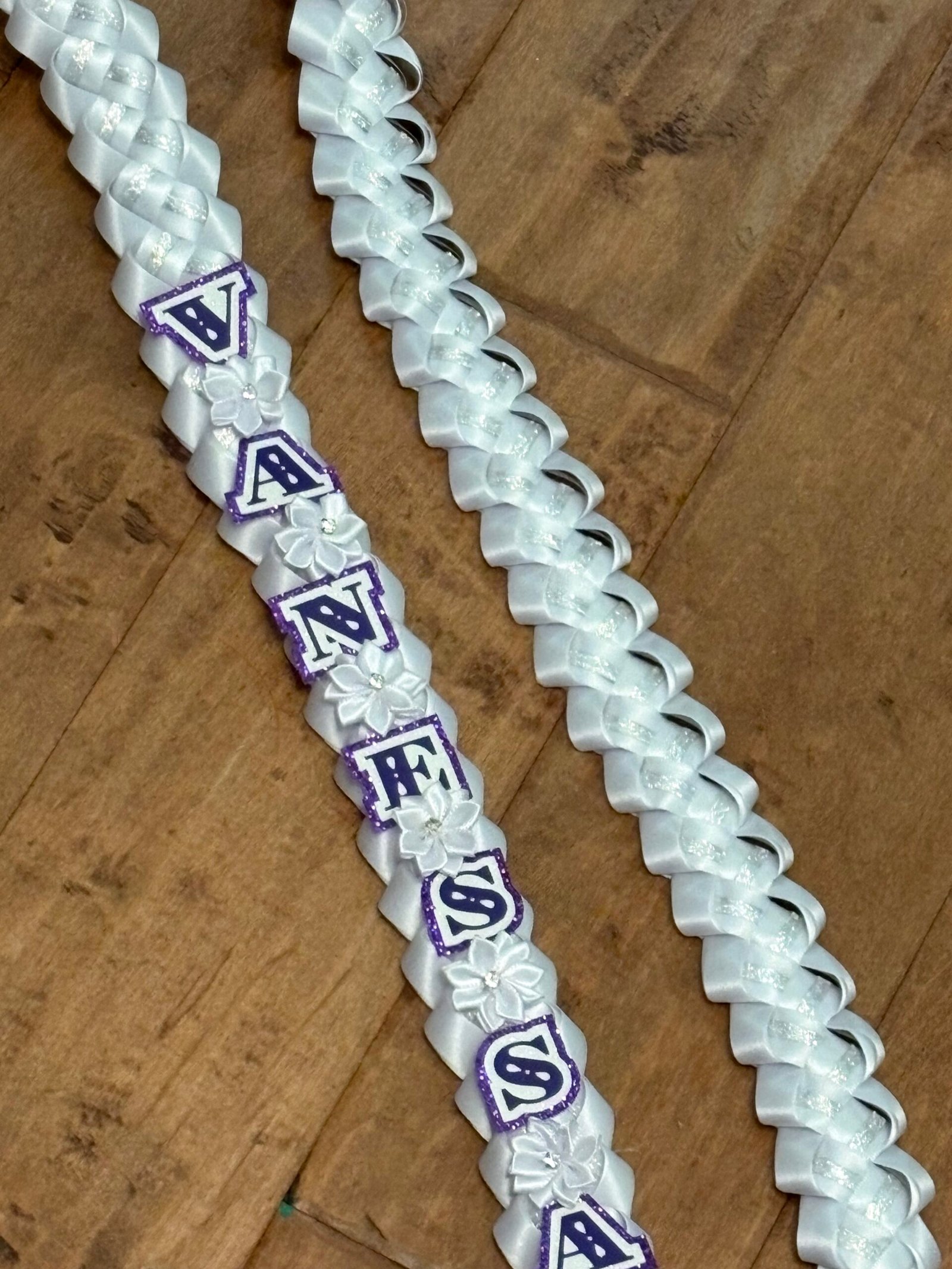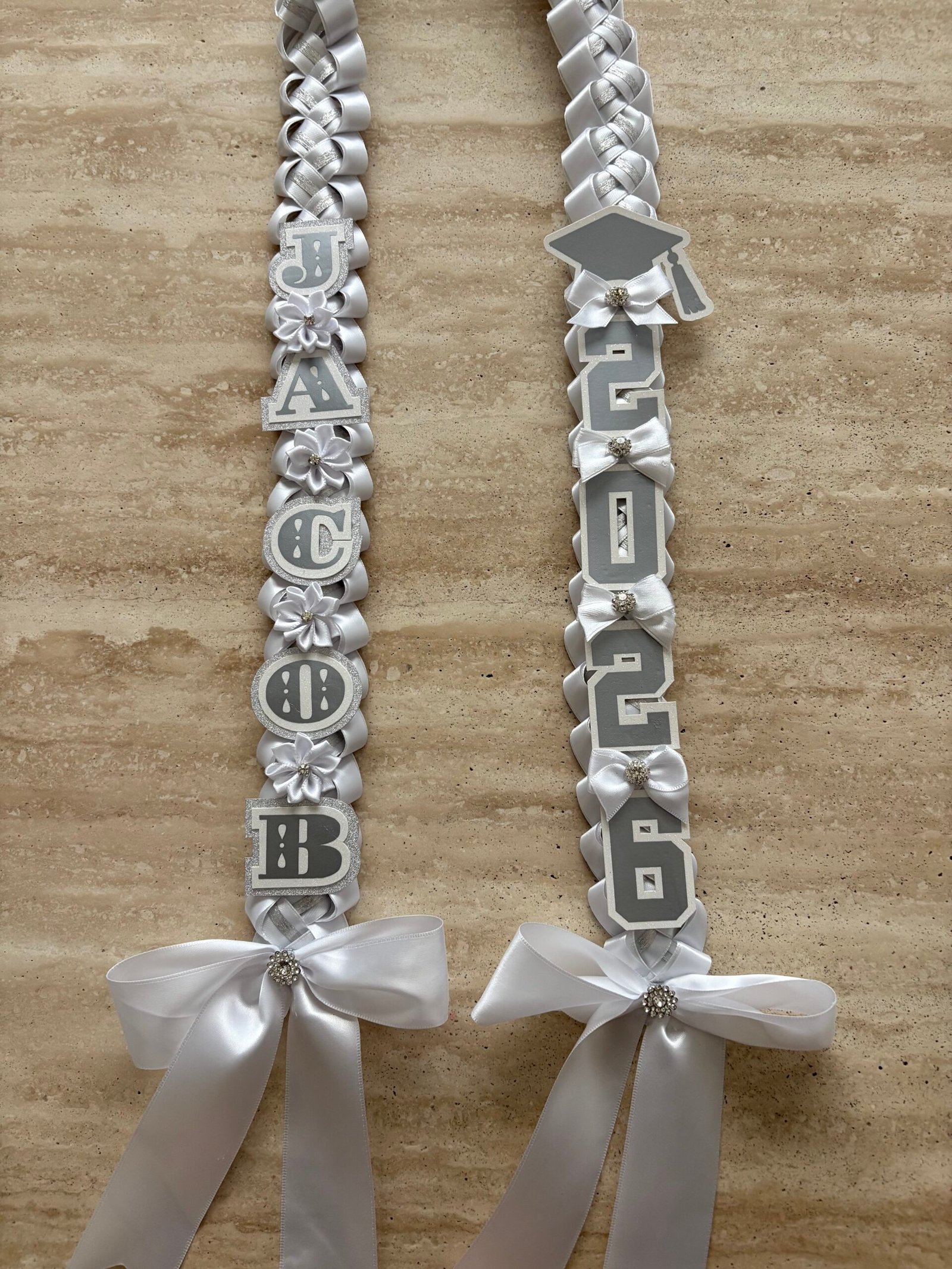 Make this milestone even more special with this personalized, elegant graduation lei. They are available in 4 ribbon combinations, triple-layer name cutouts, double-layer graduation year cutouts, double-layer cap cutout, handmade bows, flowers and lots of bling! Our leis are made with high quality double-faced satin ribbons, acetate ribbon for structure, and varying ribbons for the inner “stripe.”